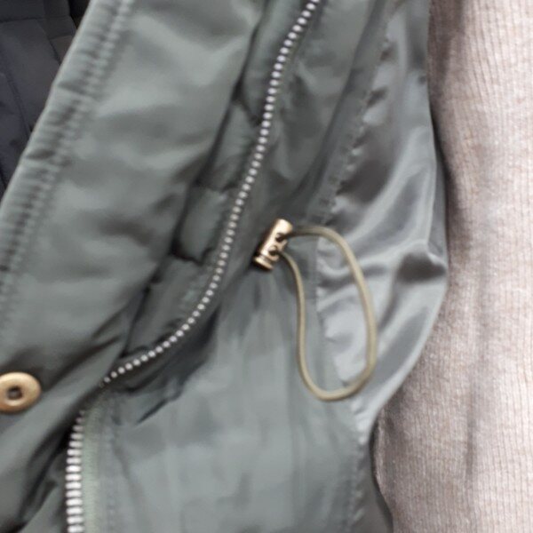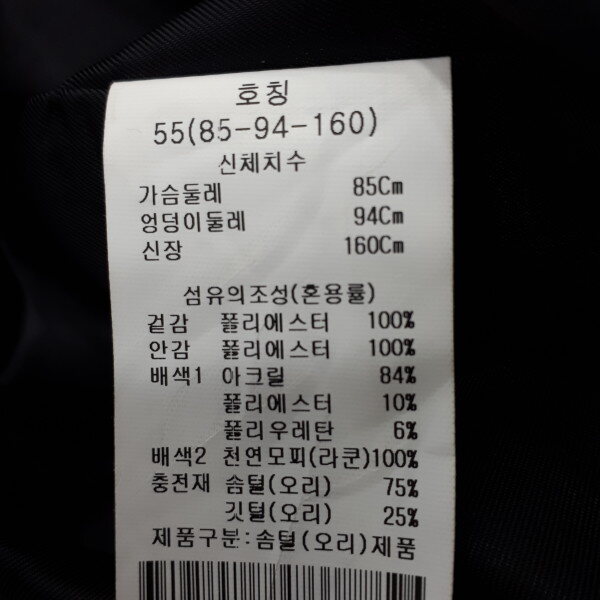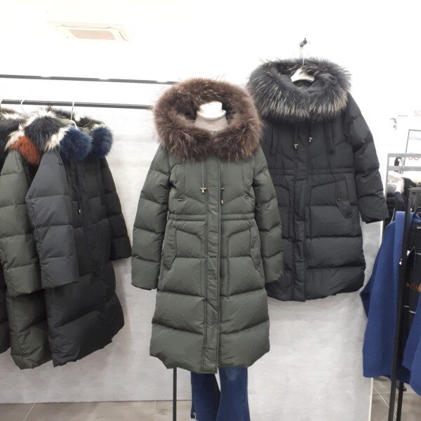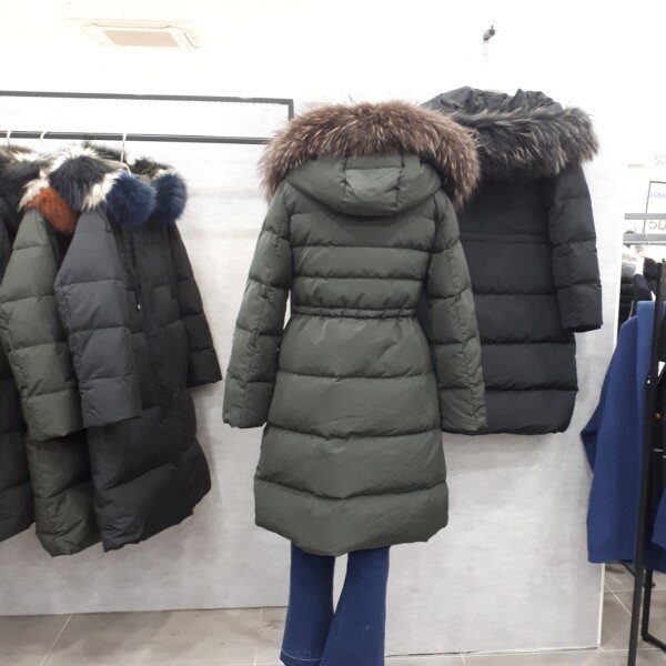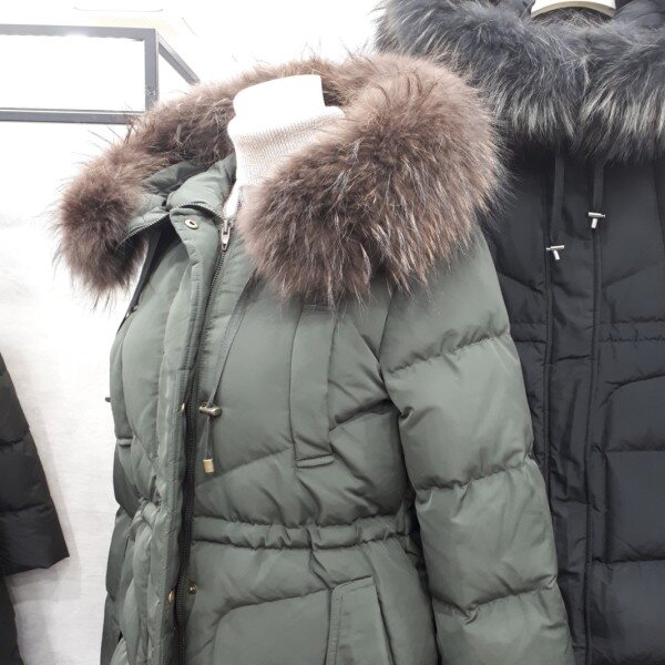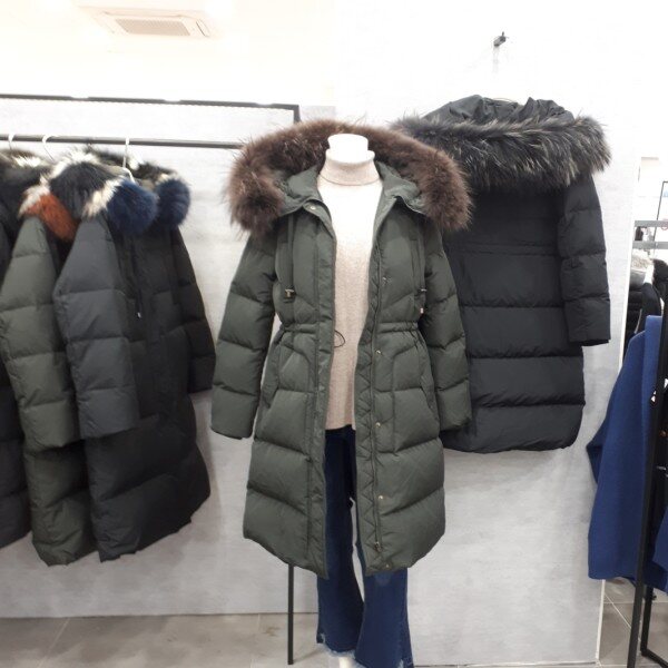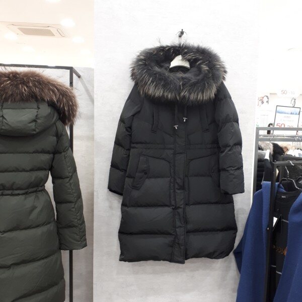 라쿤털후드에 허리 조절가능한 오리털 패딩입니다