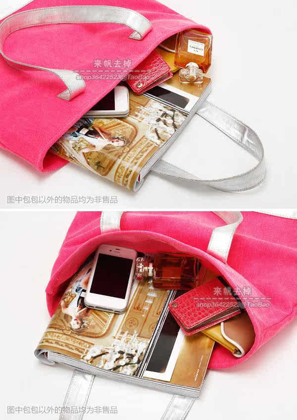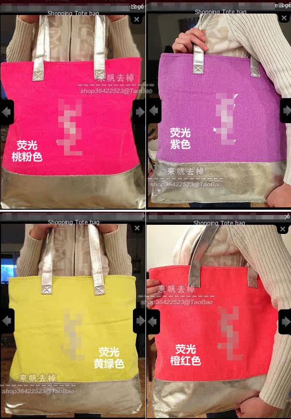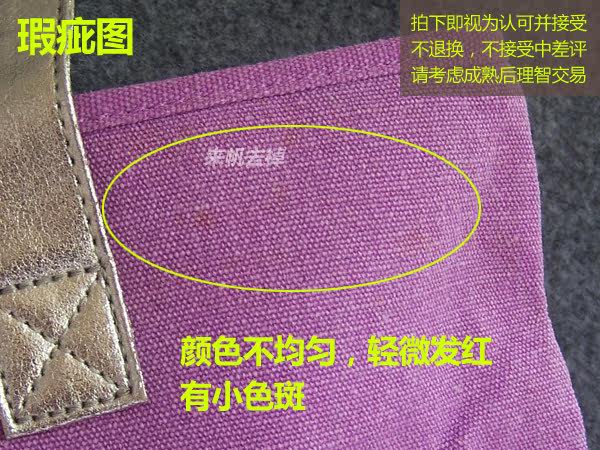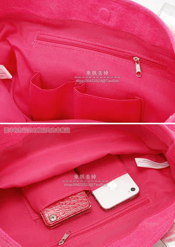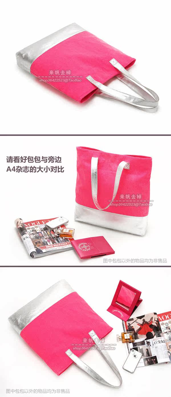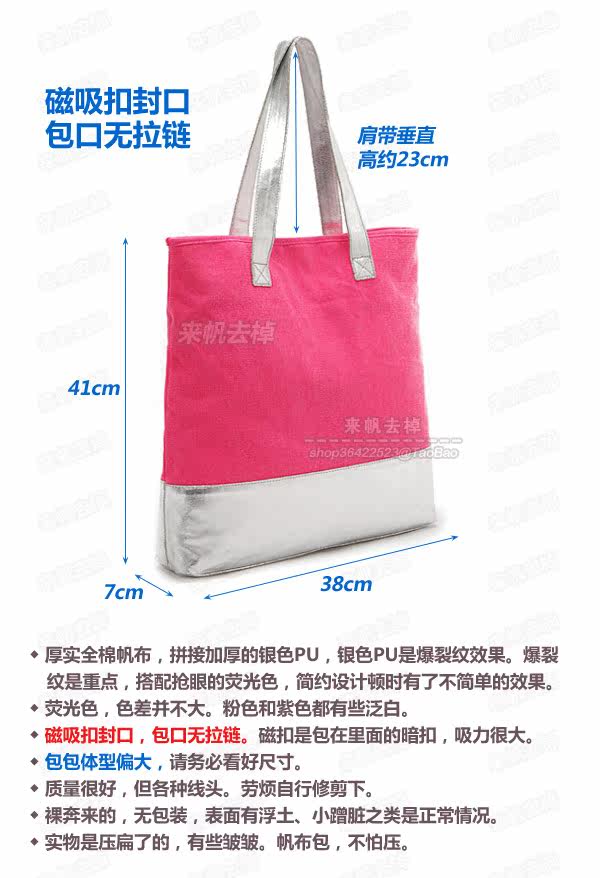 ★ 因为误了交货期,被毁单。所以,最后一道加印LOGO的工序厂里都没有做,内标部分有部分无,也都是随便订的。但整体品质并没有缩水。 ★ 磁吸扣封口,是典型的外单特点。包包体型很大,且荧光色很潮——只要这些,你能接受,那就是赚到了——很厚实的一只大帆布包! |