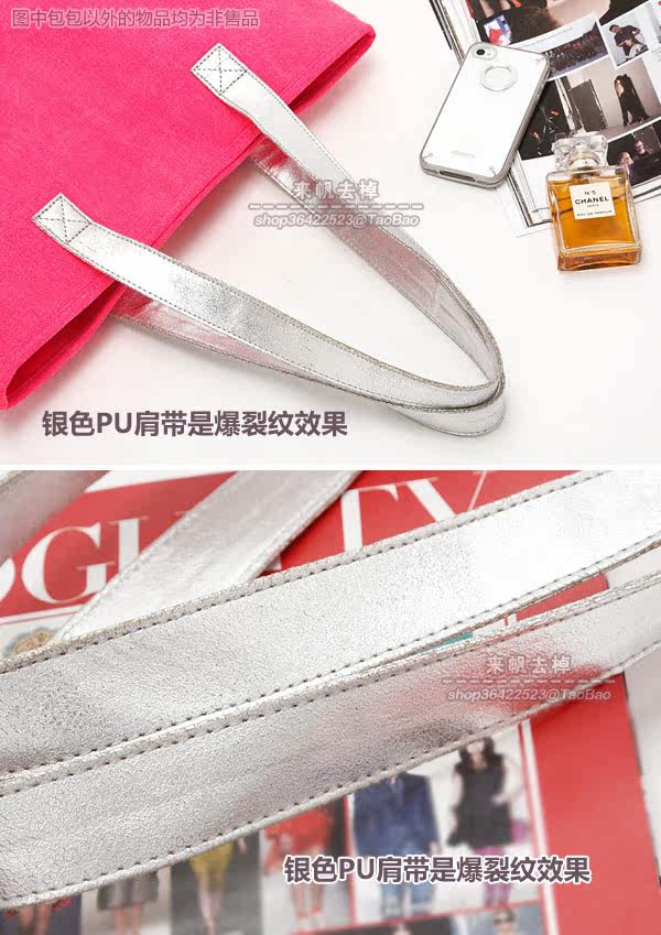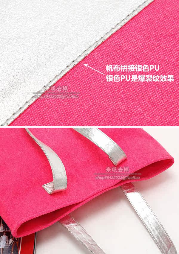 | ★ 厚实全棉帆布,拼接加厚的银色PU:银色PU是爆裂纹效果。爆裂纹是重点,搭配抢眼的荧光色,简约设计顿时有了不简单的效果。 |