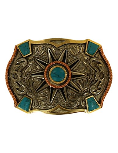 Studio : Crumrine Publisher : Crumrine Binding : Apparel Product Description Crumrine Belt Buckle: You will love this Crumrine buckle by MF Western Products. It boasts a detailed rowel and intricate scrolling around the rowel. Rope edging perfectly complements this buckle. It has turquoise stones at each corner. Tuff Guard coating guarantees the finish and craftsmanship. Add a distinctive accent to your favorite belt. 2 7/8" x 4". C10151 0