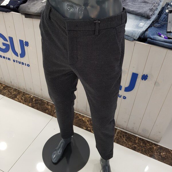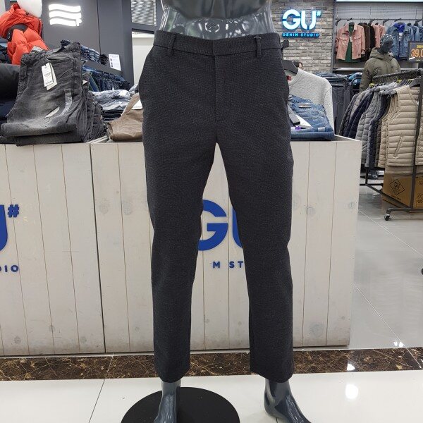 GU# 겟유즈드(남성) [기모] 밴딩 슬렉스 FULWCPT120-BKA 보온성이 좋은T/R 제모 소재를 사용. 뒷 밴딩 디테일로 편안한 착용감을 주는 테이퍼드 핏 겨울 슬랙스. 마네킨32착장.