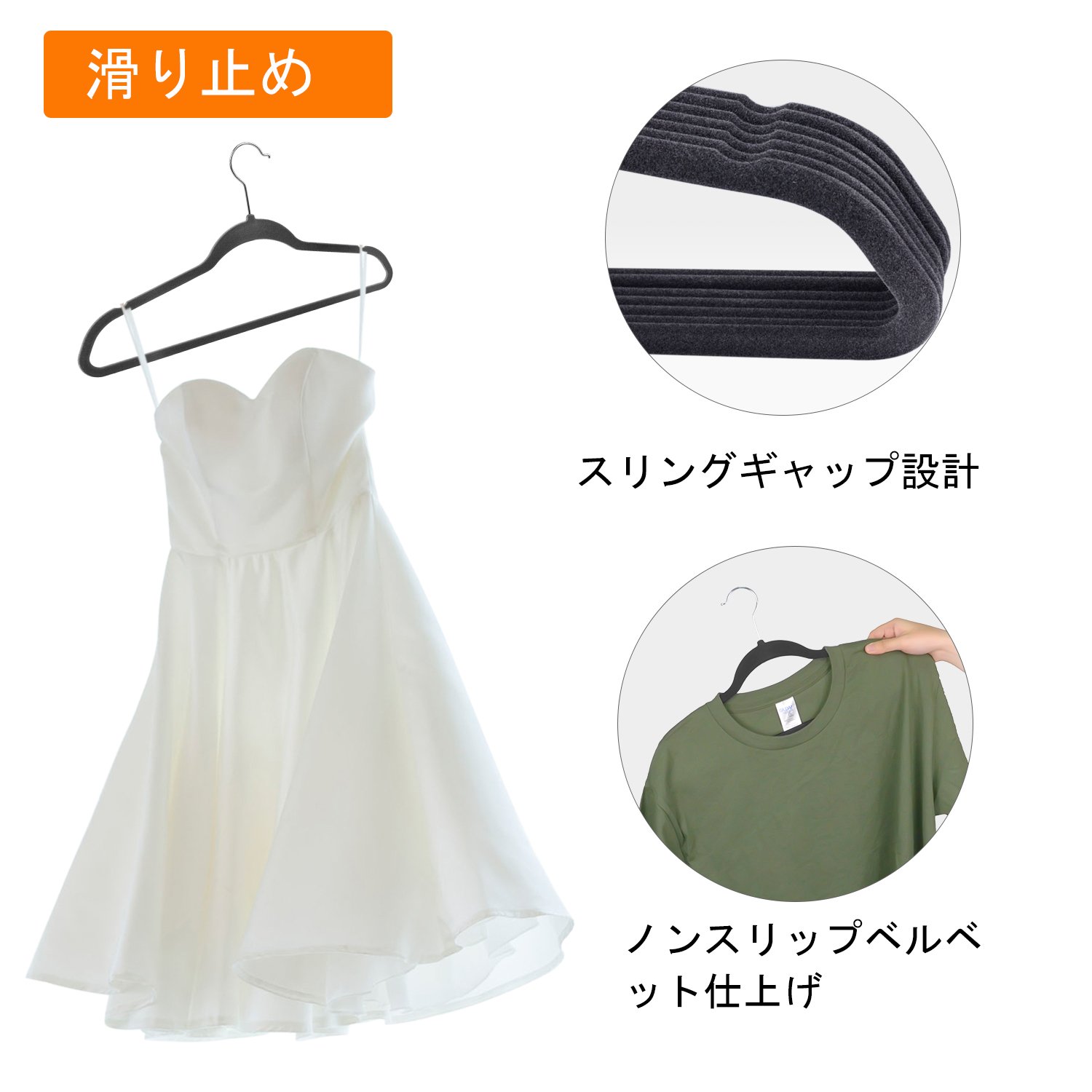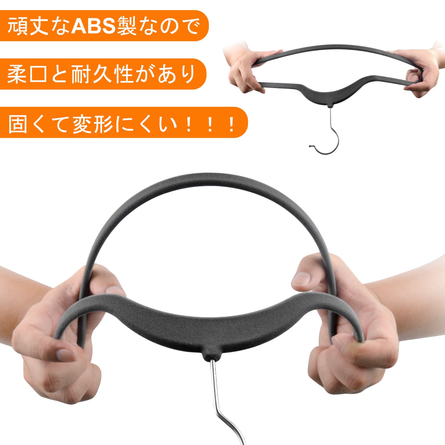 【頑丈&滑り止め】丈夫なABS製なので、曲がっても折れづらい、頑丈が抜群!ハンガーの表面に施された特殊起毛加工とくぼみの設計により、摩耗しにくく、ドレスに最適し、かけた衣類が落ちにくい!