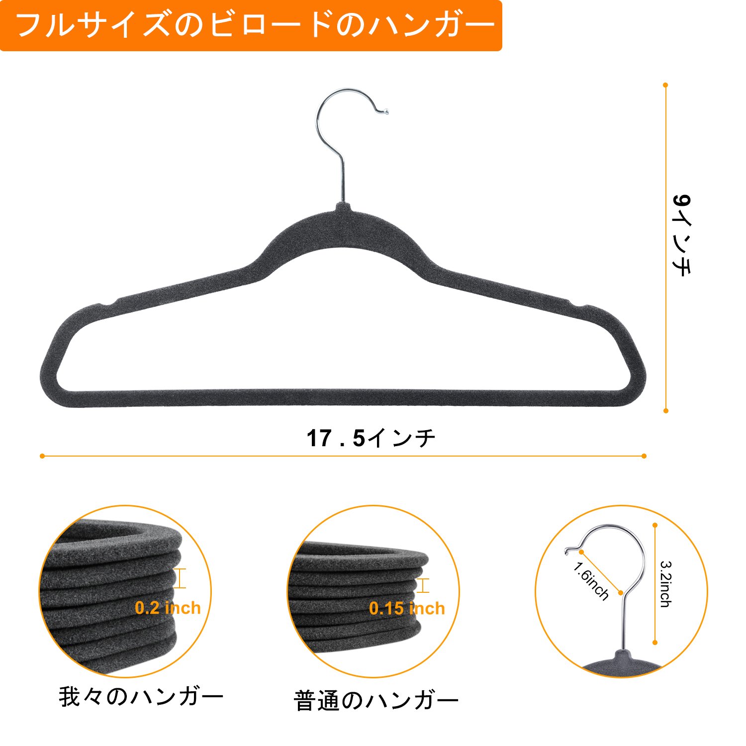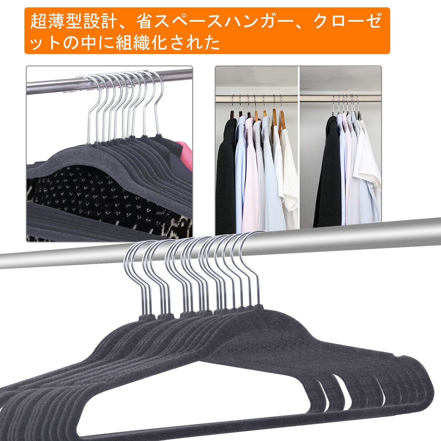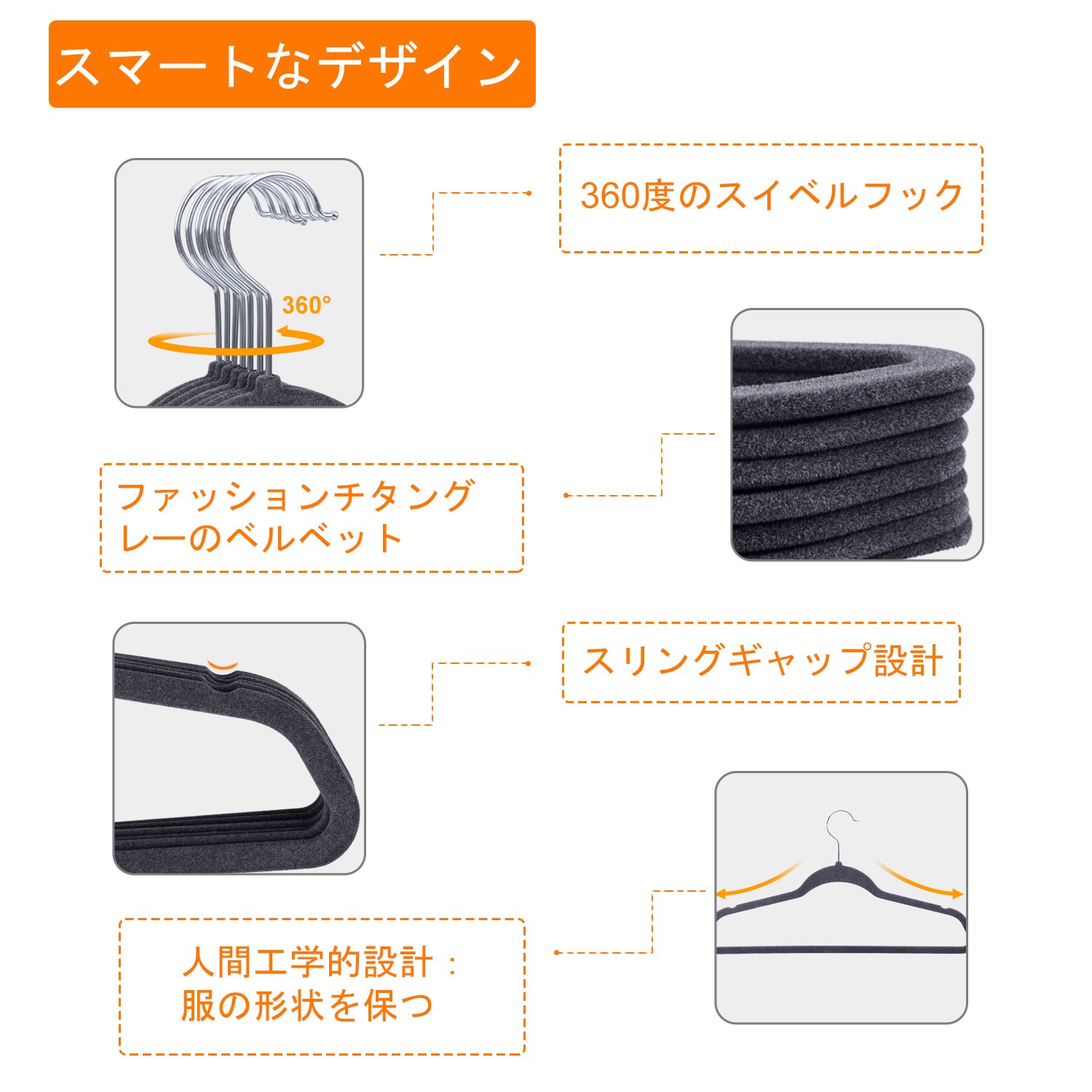 【省スペース】カラー:グレー;サイズ:44*22*0.5cm 普通のハンガーと比べて、とても軽く使いやすいです。ハンガーの厚さ5mmなので、空間を節約する、収納できる服の量がいっぱい増える。ハンガーの向きを自由に変えられる360度回転式のネックなので、服を取り外しやすく、掛けやすくて、とても便利です!