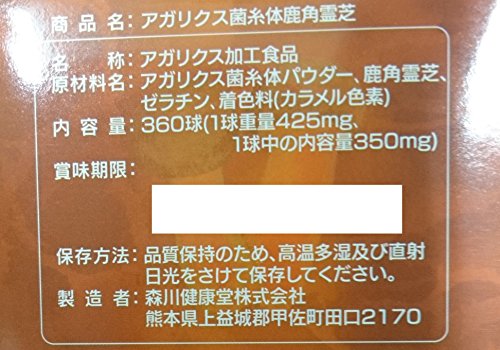 -. Feature : 原産国 : 日本 / 原材料 : アガリクス菌糸体パウダー、鹿角霊芝、ゼラチン、着色料(カラメル色素) / 栄養成分 : 【栄養成分表示5球(2.125g)当たり】エネルギー4.63kcal、たんぱく質0.82g、脂質0.12g、糖質0.07g、食物繊維0.84g、ナトリウム1.53mg、アガリクス菌糸体パウダー1.050mg、鹿角霊芝700mg / 内容量 : 360球(1球重量425mg、1球中の内容量350mg) / カロリー : 5球当たり4.63kcal / 商品サイズ (幅X奥行X高さ) : 8.4×8.3×13.2 / 質量 : 326g