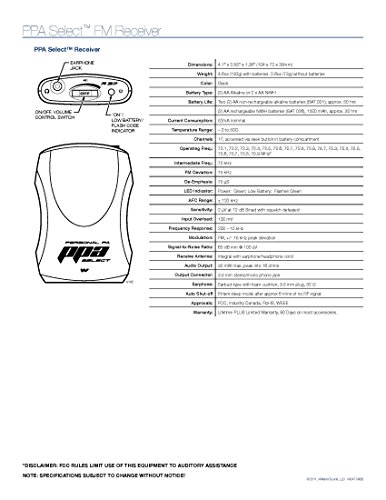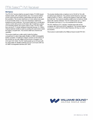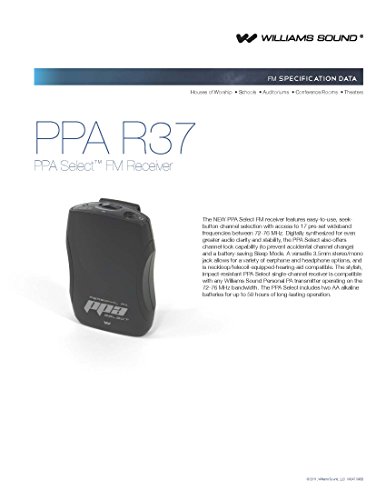 Studio : Williams Sound Publisher : Williams Sound Binding : Electronics Product Description Williams Sound PPA R37 PPA Select FM Receiver, Black Fits with PPA T46, PPA T45, PPA T45NET and PPA T27 transmitters, Seek-button access to all 17 wideband frequencies in the 72-76 MHz bandwidth Flexible and simple. The PPA Select FM receiver features easy-to-use, seek-button channel selection with access to 17 pre-set wideband frequencies between 72-76 MHz. Digitally synthesized for even greater audio clarity and stability. A versatile 3.5mm stereo/mono jack allows for a variety of earphone and headphone options, and is neckloop/telecoil-equipped-hearing-aid compatible Key Features - Fits with PPA T46, PPA T45, PPA T45NET and PPA T27 transmitters