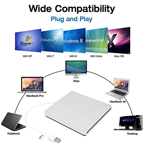 VersionTech Ultra Slim USB External DVD Drive Burner is special designed for the Apple Macbook, Macbook Pro, Macbook Air or other PC or Laptop without internal drive. No eject button design, powered by USB port from your PC or Laptop, plug and play. It's fully compatible with Mac or Windows OS, no need to install any driver program. More convenient for you to play music, movies or install software with this USB external DVD drive, copy & burning music from your laptop to a CD disc in a flash.