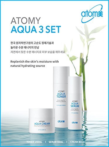 Atomy Aqua 3System Moisturizing Toner Serum Cream All Skin Type Skin Care Brand : Atomy Condition : New Components : Toner 150 ml/ Serum 50 ml (Whitening)/ Cream 80 ml (Whitening) Feature : Trouble Care, Moisturizing, Wrinkle improvement, Anti-Aging, Whitening Package including : Skin Care 1 Set (3pcs) Made in Korea OriginalFeature