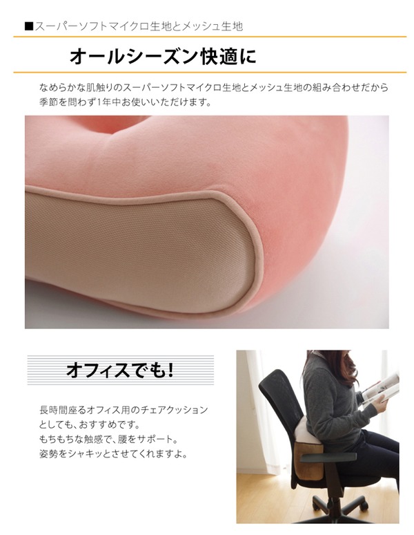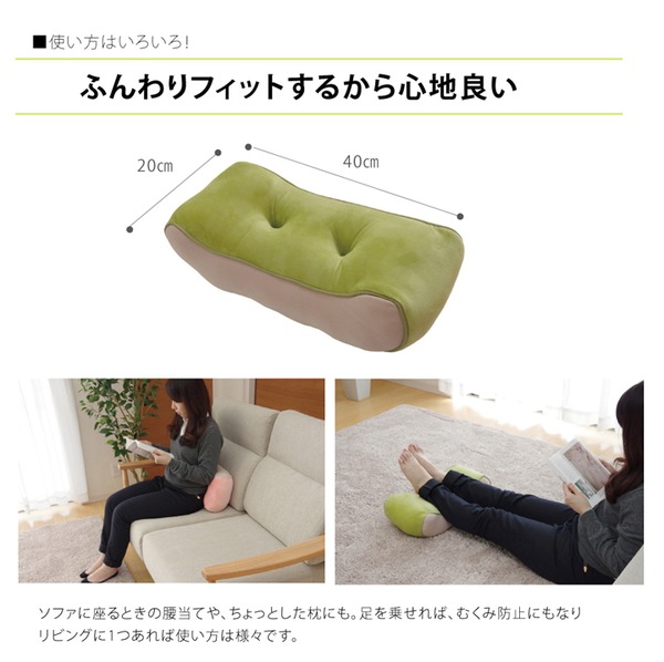 ソファに座るときの腰当てや、ちょっとした枕にも。足をのせればむくみ防止にもなる便利なクッションです。シンプルなデザインなので、お部屋のテイストを問いません。長時間座るオフィス用のチェアクッションとしてもおすすめです。もちもちな感触で腰への負担をやわらげてくれます。表地は、なめらかな肌触りのスーパーソフトマイクロ生地とメッシュ生地の組み合わせなので季節を問わずオールシーズンご使用頂けます。中材は低反発ウレタン3mmとポリエステル綿を使用。綿をウレタンのシートで包むことにより、沈み込み過ぎず、独特のもちもちした柔らかなタッチ感に仕上げました。