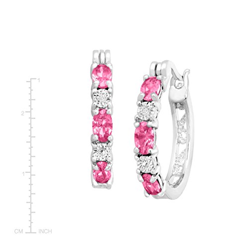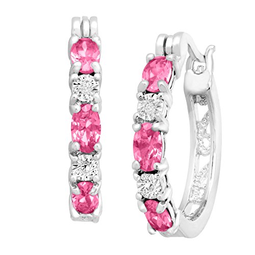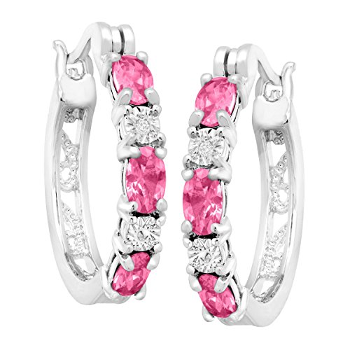 A never-fail style gets the special treatment with a smattering of radiant gemstones! Trios of oval-cut created pink sapphires are joined with diamond accents in a set of platinum over brass hoop earrings. Pieces measure 7/8 inches in diameter.Feature