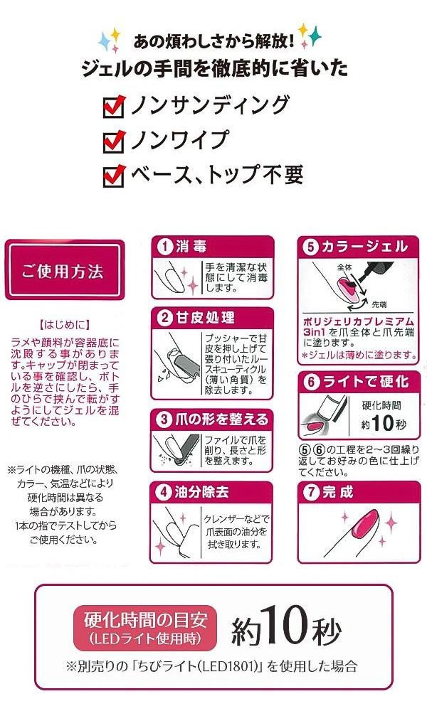 忙しい毎日でも自宅で簡単にジェルネイルをしたい、そんな方にオススメです。これ1本でベース・カラー・トップの3役で便利♪ |