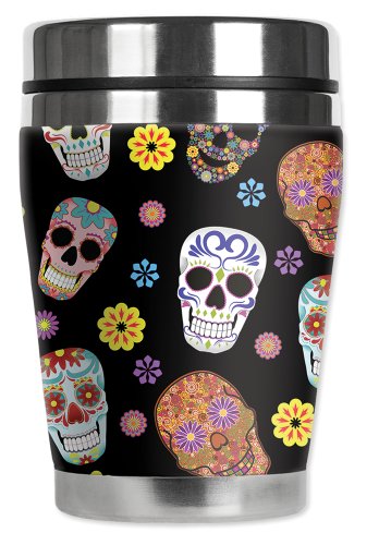 Mugzie Sugar Skull Toss "Mini" Travel Mug with Insulated Wetsuit Cover, 12 oz, Black