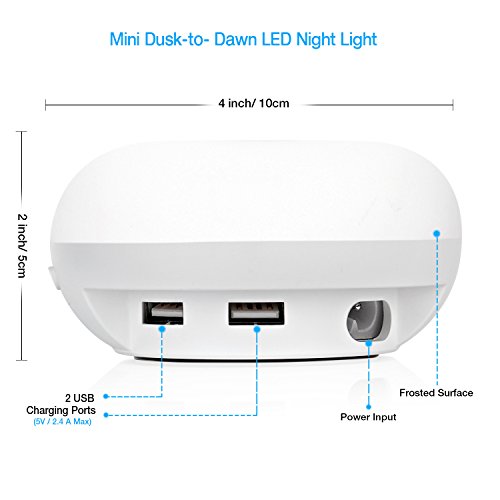 This is the 2-in-1 designed LED night light built-in dusk to dawn sensor, it'll automatically turn light on at dusk and off at dawn, there also features 2 USB ports allow you to charge 2 devices at once making sure your phone and other electronics are always charged and ready to go ! Dusk to Dawn Sensor It has an inbuilt dawn sensor that turns on and off the light automatically while switching on, the brightness depends on how much light is in the room.