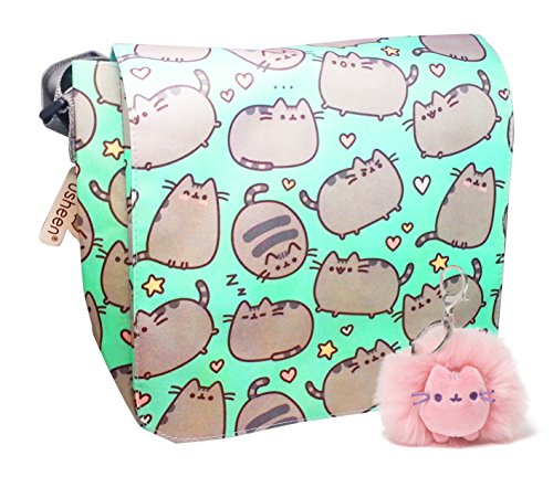 -. Feature : Pusheen knows you need the perfect bag to keep your, so she created this adorable messenger/cross body bag for you. The supercute mint green canvas bag has an all over Pusheen P.R.Int. 14.5 x 12 inches / Features an extra large main compartment with a zipper pocket inside and a snap flap closure on the front. Lightweight bag great for school, shopping, commuting. Added safety with cross body strap / Comfortable adjustable shoulder strap 2 inches wide makes the bag easy to carry. Made of durable, 100% polyester canvas. Does not have padding or additional structural support / Supercute Pusheen poof keychains are soft and hable, 4 inches. Sturdy keychain loop for on-the-go display. Surface-washable; Ages 8+ / Colors are selected randomly at time of shipment based on availability. Select GIFT at check out to include your message