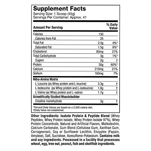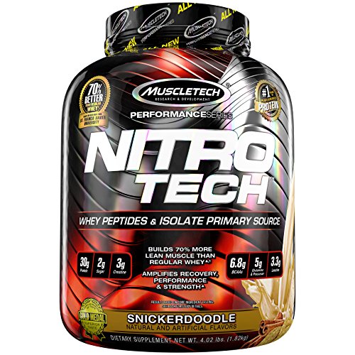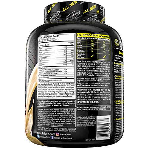 ReleaseDate : 2017-12-01 Studio : Iovate Health Sciences Incorporated Publisher : Iovate Health Sciences Incorporated Binding : Health and Beauty Product Description Nitro Tech is scientifically engineered whey protein powder designed for anyone looking to build more muscle, improve their strength and enhance overall performance. NitroTech from MuscleTech contains pure whey protein isolate and peptides as the primary source. Every scoop provides 30 grams of ultra-pure whey protein and 6.9 grams of Branched Chain Amino Acids (BCAAs) along with a strength-enhancing 3 gram dose of creatine. At MuscleTech we believe that you shouldn't have to sacrifice macronutrients for results. The result is a great-tasting formula that doesn't pack the extra sugar and carbs you'll see in other protein powders. Nitro Tech gives you more protein per scoop and a better overall macronutrient profile. 0