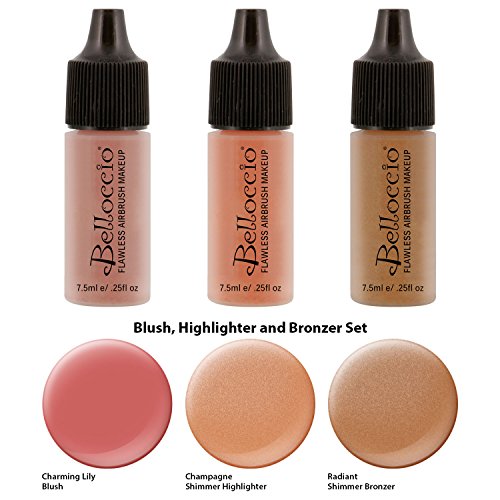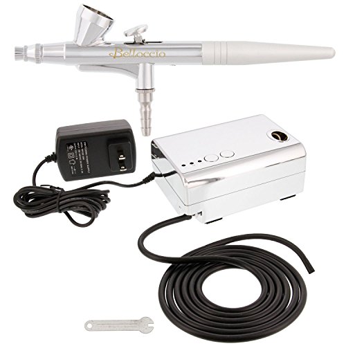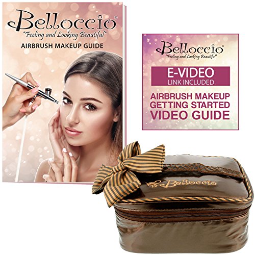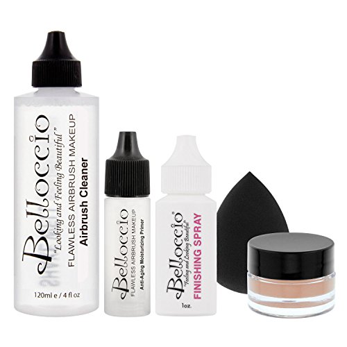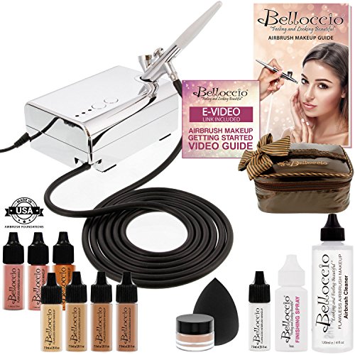 Belloccio Professional Beauty Airbrush Cosmetic Makeup System with 4 Tan Shades of Foundation in 1/4 Ounce Bottles - Kit Includes Blush, Bronzer and Highlighter and 3 Bonus Items and a Video Link