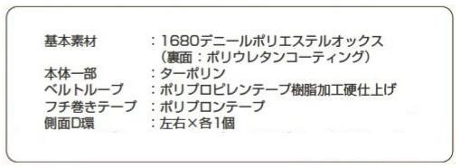 | 素材・材質 | 1680デニールポリエステルオックス(裏面:ポリウレタンコーティング)、ターポリン、ポリプロピレンテープ樹脂加工、ポリプロンテープ |