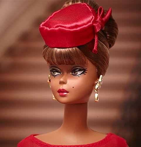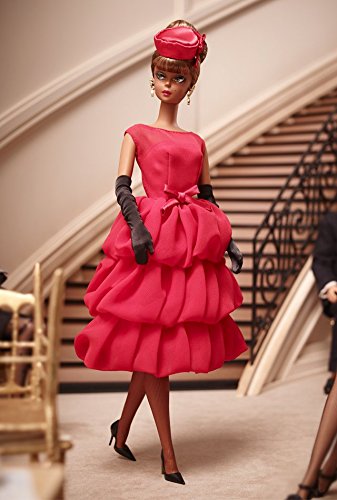 Barbie doll is simply stunning in an ensemble with dramatic details and highly detailed accessories. Ready to make a grand entrance at the next soirée, Barbie doll wears a coral satin evening coat with a cape-like collar over a lipstick red cocktail dress with tiers of flirty chiffon. Star-worthy accessories include a coral satin cocktail hat with feather trim, black stretch charmeuse shirred evening gloves, along with golden rhinestone earrings and a matching floral cuff. The finishing touches include a pair of glossy d’Orsay stiletto pumps and a glamorous updo. Doll is cast in Silkstone and features the original 1959 Barbie face sculpt. Fashions designed exclusively for the Silkstone Barbie doll body; not for use with other Barbie dolls. Doll stand and Certificate of Authenticity included. Each sold separately. Colors and decorations may vary. Dolls cannot stand alone without stand and may not be able to hold accessories as shown. For the adult collector.Feature