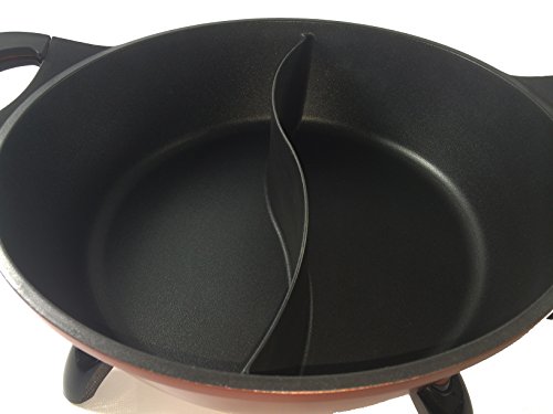 Deluxe Asian Divided Hot Pot for Asian Hot Pot, Mongolian Hot Pot, Japanese Shabu-Shabu, Steamboat style cooking. Aluminum Molded 12-Inch diameter 1400-watt Electric Divided Hot Pot with Vented Glass Cover. Features: Large 4-liter capacity divided pot with adjustable 1400 watt heating element - Cleaner and safer to use than a gas stove or burner. One-piece Aluminum molded divided pot with non-stick surface can't leak from one side to the other.Feature