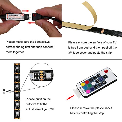 【Easy Installation】- This flexible TV backlight can be sticked easily at your TV background through 3M adhesive tape. You can remove the tape from the back of the strip lights, please clean the appearance of your TV background, which can make sure the firm attach