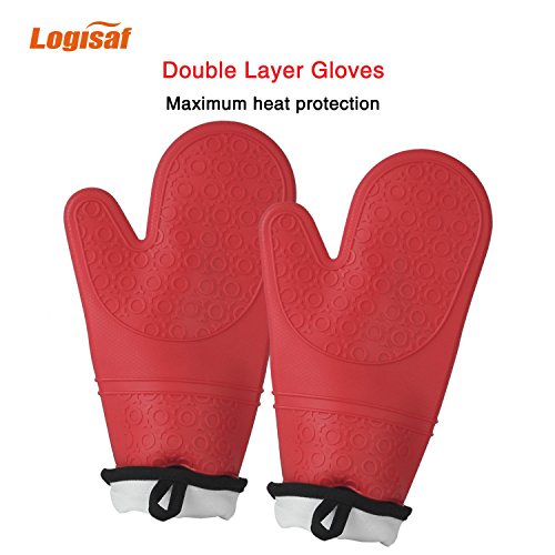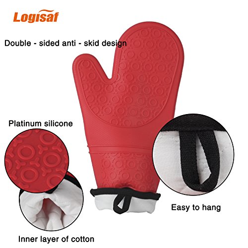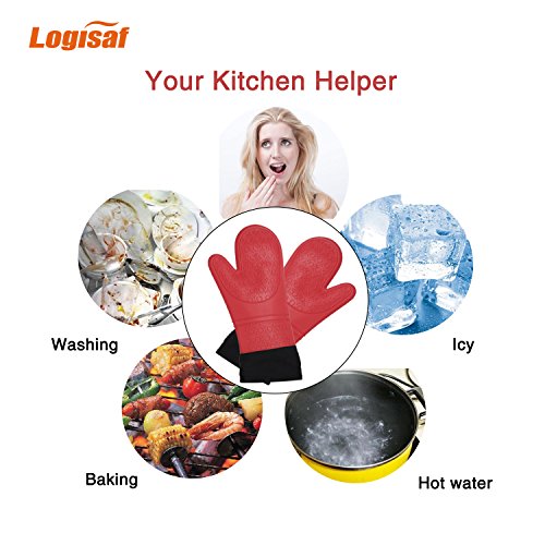 - 1.GREAT PROTECTION: The Logisaf silicone kitchen gloves is carefully designed with dual-layer, an outer silicone glove and inner cotton layer, Outstanding heat-resisting and cool-resisting, easily cope with -104℉ to 446℉. The Extended Protection Constructed from Thick Cloth with Cotton can protect your forearms well! Heat resistant up to 446° F, they can be used when cooking or grilling as pot holders, or to place hot pots and pans on top of.