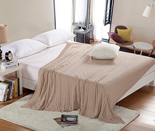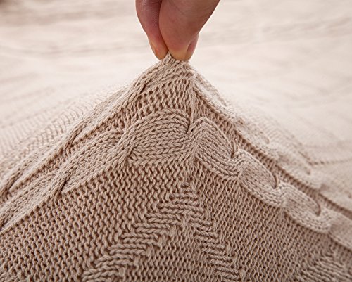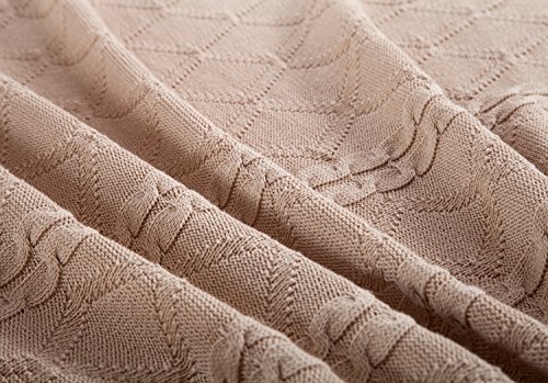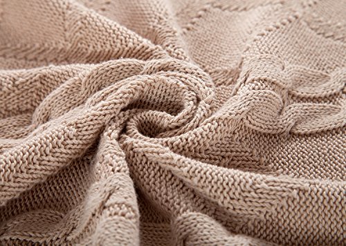 All Cotton Knitted Throw Diamond & Cable Pattern Lightweight Sofa Blanket, 43x70 Inches, Beige
