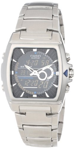 Amazon.com Product Description Powerfully styled and packed full of robust timekeeping and environmental features, the Casio Edifice stainless steel watch for men (model EFA120D-1AV) holds its own in both professional quarters and rugged outdoor terrain. This round analog/digital timepiece features a stainless-steel bezel framing a standard analog dial with white stick hour markers and thin oval skeleton hands. It also offers digital windows for showing current date as well as the watch's chronograph, which can measure events down to 1/100 of a second. Other stopwatch features include a 50-record memory, single stopwatch mode with lap times and total elapsed time, a dual mode with two independent lap times, and a 100-hour capacity. It also includes a thermometer that measures every even-numbered minute. Other timekeeping features include: * World time with 30 time zones (50 cities) with city code display and daylight saving on/off * Daily alarm * Countdown timer with 100-hour range * Auto Calendar (pre-programmed until the year 2099) * 12/24 hour formats This watch also features a stylish stainless steel bracelet, ±30-second accuracy per month, Afterglow backlighting, and water resistance to 100 meters (330 feet)--offering protection from accidental splashes as well suitable for swimming, snorkeling, and light recreational diving. 0