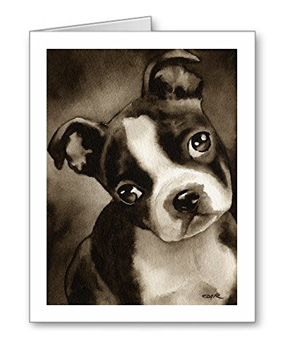 -. Feature : Boston Terrier Puppy artwork by watercolor artist DJ Rogers. / Note card size is 4.25 x 5.5 inches / Matching white envelopes included. / Note cards are blank inside for your personal message. / Suitable for framing.
