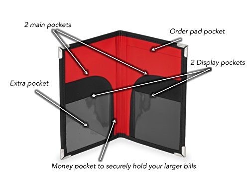-. Feature : ORGANIZE AND SIMPLIFY: 7 pocket patent-pending design. Order pad pocket, money pocket, two main pockets, display pockets, and an extra triangle pocket / SATISFACTION GUARANTEED: 60 Day Return/Exchange Policy / WIDER BINDING: a wider binding that allows the book to close and holds your pen perfectly / SLEEK AND THIN DESIGN: so you have more room for money and cc slips, but does not bend or warp with regular use! / TALLER SIZE FOR TALLER ORDER PADS: Taller book: 9.25" tall, 5" wide