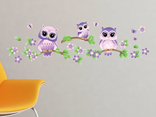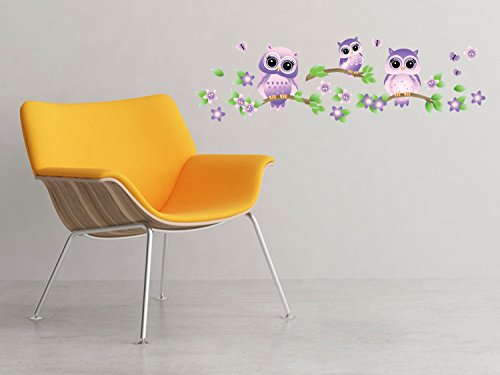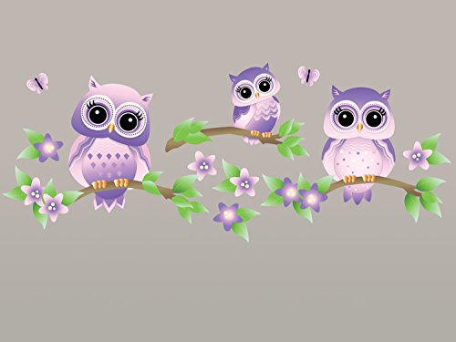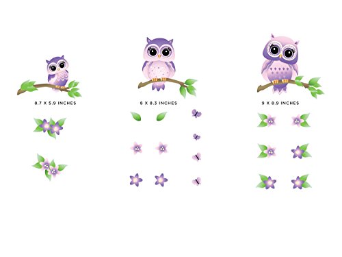 PRODUCT DIMENSIONS - Owl 1 (with branch) - 8.7" x 5.9", Owl 2 (with branch) - 8" x 8.3", Owl 3 (with branch) - 9" x 8.9". Comes with 4 Buttlerflies and 14 Flowers. Matte finish looks like a painted mural on your wall and leaves no sticky residue