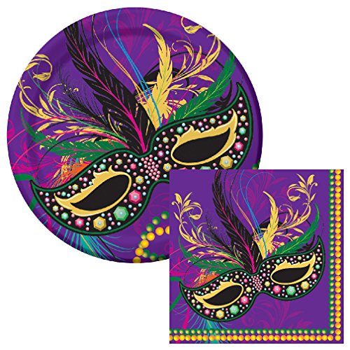 Mardi Gras Mask Lunch Plates & Napkins Party Kit for 8