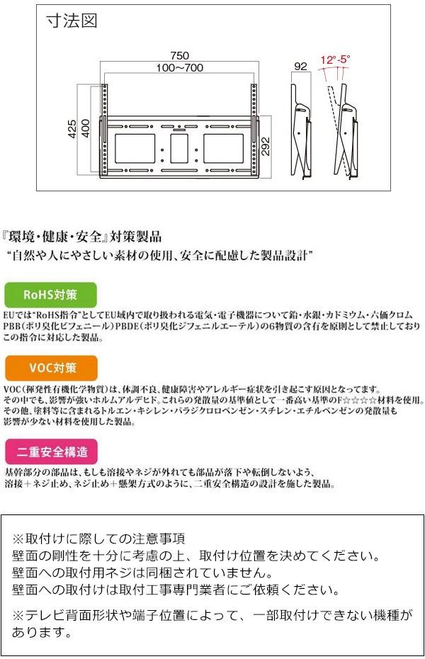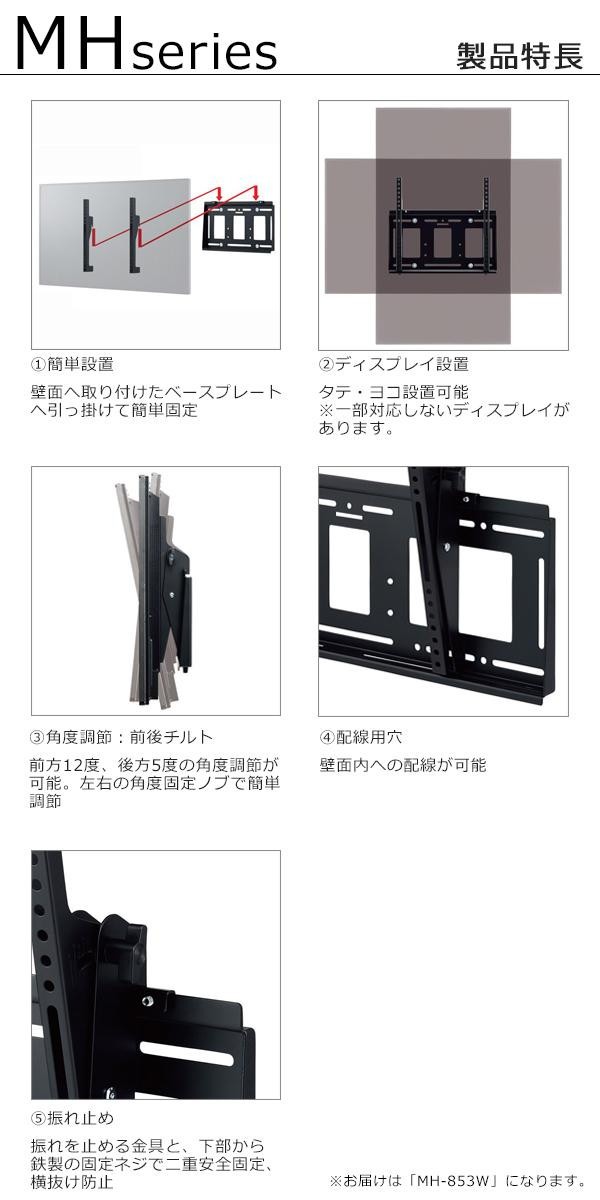 | 仕様 | ~85V型対応 角度調節タイプ(前後チルト可) 角度調節:前方12度、後方5度(任意調節可能) 総耐荷重:110kg(※取付ディスプレイ:110kg以下) 取付ピッチ:W100~700mm、H100~400mm |