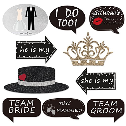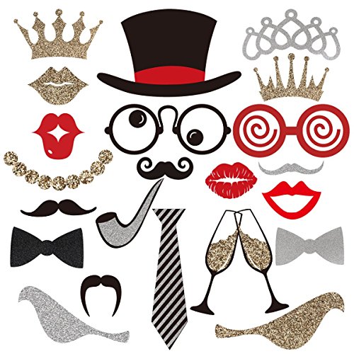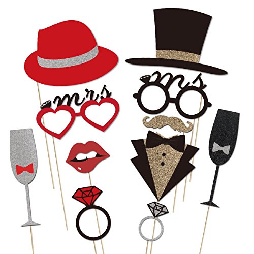 - This kit comes with a huge variety of novelty "disguise" props for all your playful and party occasions. Includes romantic words: he is my, she is my, and rings, necklace, mustaches, eyeglasses, red lips, neck ties, crowns, rose and much more.