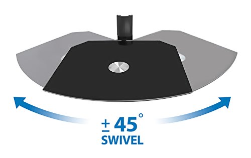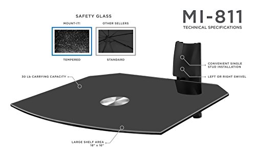 -. Feature : Elegant, modern and decorative aluminum plate and glass triple wall shelf designed to hold DVD players, DVRs, HD recorders, Cable TV Boxes, AV components, gaming systems, for storage of CDs, DVDs and any other media, even to mount projectors. It will complement your wall mounted TV and help you achieve an uncluttered look with no need for large media stands or TV furniture. / Shelf size: 17.5 inch Wide, 14 inch deep. The black tempered glass shelf is tinted and is oversized to support of various equipment. The wall bracket measures 29.94 inches high and should be installed on a wall stud for safe floating shelf installation. The wall bracket has cable management holes that allow you to route cables neatly to your components. / With its heavy-duty design, this shelving system can support up to 22 lbs. The tempered black glass is 6 mm (approximately 1/4 inches) thick. / Standard mounting hardware and easy to use instructions included. It is very easy to install. This shelf can be installed in one corner on the wall with an adjacent on the other corner. Easy to mount the shelf on the wall with the provided wall-mounting bracket. / Mount-It! experience and guarantee. Mount-It! is the expert in television wall mounts and home theater accessories. We apply our decade long experience in this field to offer the best features at value prices. All our products are guaranteed for satisfaction. Contact our friendly customer support team for any questions or issues.