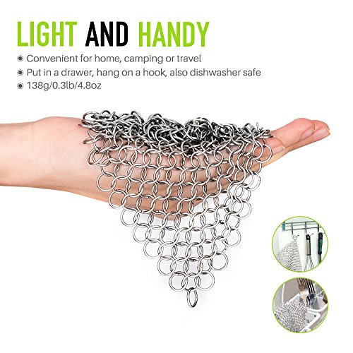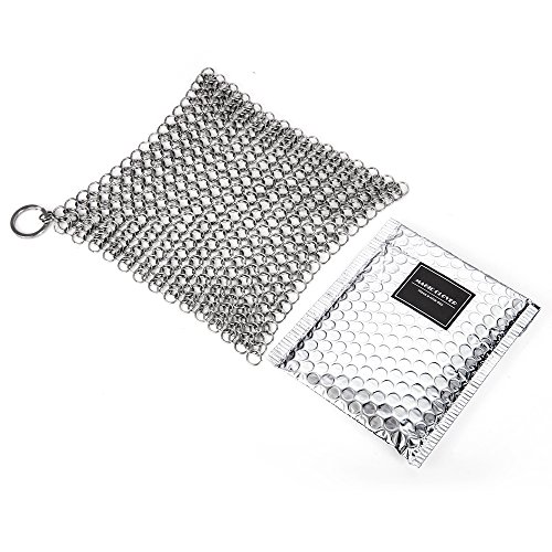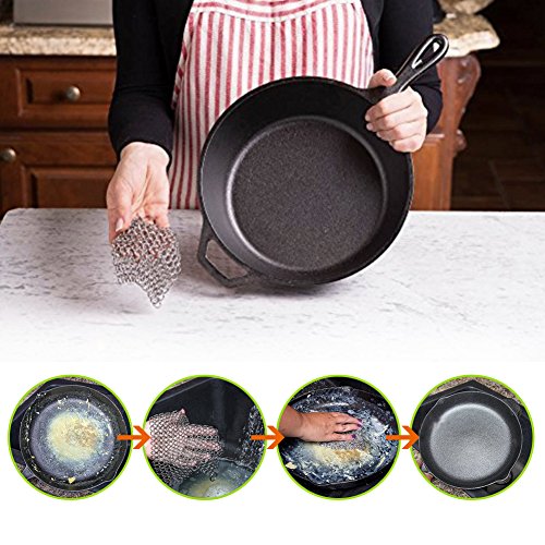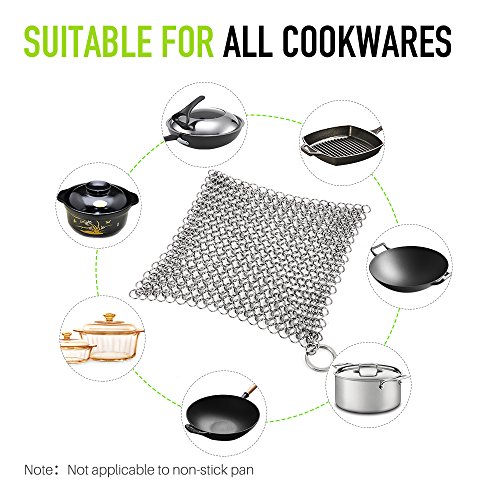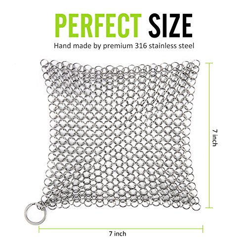 Magic-Clover XL 7x7 Inch Cast Iron Skillet Cleaner (Restaurant Quality 316 Grade Food Safe Stainless Steel Chainmail Scrubber), Cast Iron Cleaner for Seasoned Grill Pans This chainmail scrubber is designed for cleaning your kitchen cookware like cast iron pans, glassware, baking sheets, cookie sheets, tea pot, waffle maker, pie pan, Dutch oven, casserole dishes, etc.