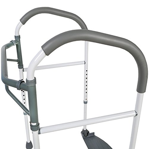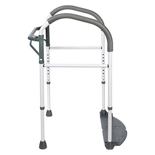 Studio : SUPPORT PLUS Publisher : SUPPORT PLUS Binding : Health and Beauty Product Description Sit and Stand with Ease Ergonomically designed frame with sturdy arms and non-slip feet fits around toilet seat to provide assistance to those who need support sitting down or getting up from a toilet. Generously cushioned armrests and weight-bearing foot pedals assure stability by using the user's own body weight for added security. Portable, economical and height adjustable from 27" - 35" for all types of toilets. Take it with you anywhere or easily store it away. Supports up to 220 lbs. Measures 20 " between arms and 20" from back bar to front support.Ergonomically designed frame Generously padded handles for comfort Adjustable to fit different heights o toilets Folds up for travel or storage Supports up to 220lbs. 0