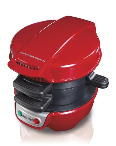 Forget the fast food drive-through. With the Hamilton Beach Breakfast Sandwich Maker, you can enjoy a hot, homemade breakfast sandwich in under 5 minutes. Simply place the ingredients inside, building your sandwich with the egg (or other internal ingredients) on the cooking plate, and close the lid. Slide the cooking plate out and your sandwich assembles itself. Open the lid and your hot breakfast sandwich is ready to eat. Easy to Use Simply place the ingredients inside, building your sandwich with the egg (or other internal ingredients) on the cooking plate, and close the lid. Slide the cooking plate out and your sandwich assembles itself. Open the lid and your hot breakfast sandwich is ready to eat.