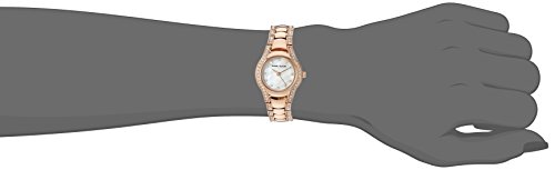 Case accented with 36 clear swarovski crystals; mineral crystal lens; mother-of-pearl dial with rose gold-tone hands and crystal markers