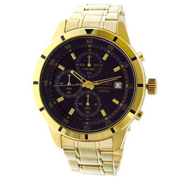 クオーツ、10気圧防水、クロノグラフ、日付カレンダー、カラー:ブラック(文字盤)、ゴールド(ベルト)