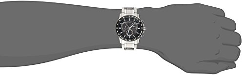 Silver-tone dive watch featuring black tachymeter topring and round guilloche dial with three chronograph subdials