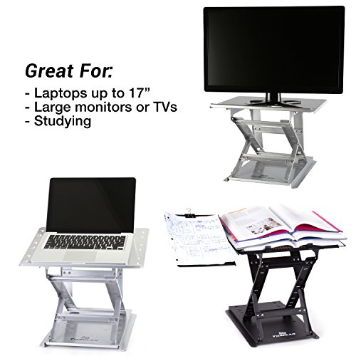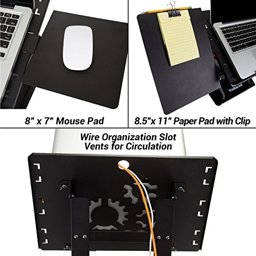 81 ADJUSTMENT: Easy-to-install and adjust TriGear Laptop Stand has 9 height x 9 angle options. Includes Mouse Pad (for left and right-handed users) and Paper Pad. COMPATIBLE WITH: 10, 11, 12, 13, 15, and up to 17-inch long laptops; works with Sony, Samsung, Lenovo, LG, Microsoft PCnotebooks, chromebook, Apple Macbooks; HD monitors, LCD/LED/OLED flatscreen TVs, SmartTVs, touch screen tablets, drawing tablets; also works for reading books, music sheets, as a writing stand, etc.