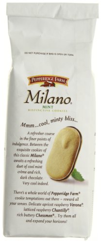 -. Binding : Grocery -. Brand : Pepperidge Farm -. EAN : 0014100079477 -. Feature : High Quality Premium Snacks made from real ingredients. / Decadent chocolate and crispy baked cookie sandwich together / Made with real ingredients, chocolate, mint, and butter / No Trans Fats. Supports Label For Education. Visit www.labelsforeducation.com / Tell us what you think of our baking. Call us toll free at 1-888-737-7374 -. Label : Pepperidge Farm -. Manufacturer : Pepperidge Farm -. Model : 0001410007947 -. MPN : ll-7947 -. PartNumber : ll-7947 -. ProductGroup : Grocery -. ProductTypeName : GROCERY -. Publisher : Pepperidge Farm -. Size : 7 oz -. Studio : Pepperidge Farm -. Title : Pepperidge Farm Mint Milano Cookies, 7 oz Package -. UPC : 014100079477