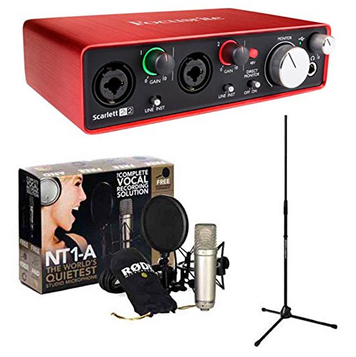 -. Feature : The NT1-A 1" diaphragm provides a wide frequency response and excellent signal-to-noise ratio / The cardioid polar pattern of the NT1-A effectively minimizes off-axis noises such as room ambiance, monitors, and off-axis instruments / The Scarlett 2i2 has direct monitor switch on the front panel allows for hearing what is being recorded through speakers or headphones, without the signal having to go through the computer (avoids latency) / The Scarlett 2i2 has excellent digital performance with 24-bit resolution at sample rates of up to 96KHz