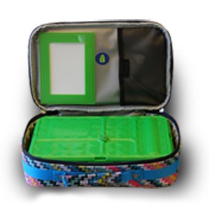 CARRYING BAG: Zippered Insulated Carrying Bag features a pocket to hold napkins and eating utensils, a White Board to write messages, a Name tag, and measures 13 x 9 x 3 inches.
