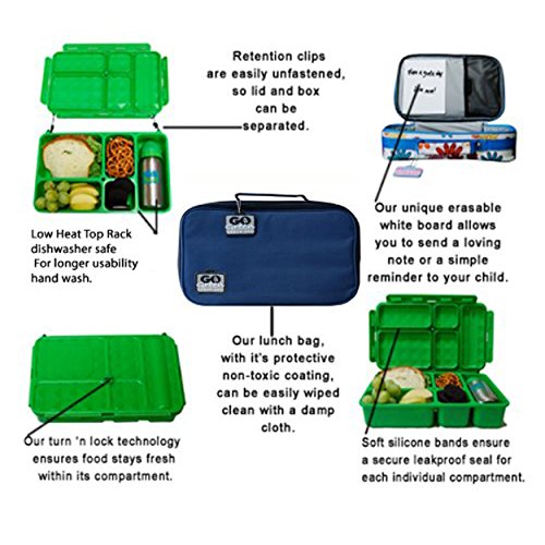 GO GREEN LUNCH BOX SET includes a 5 Compartment lunch box, Insulated Carrying Bag, 8 oz Beverage Bottle, and reusable Gel Freezer Pack