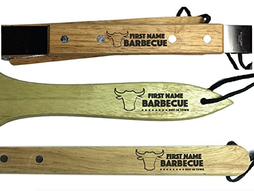 Set contains 3 grill utensils with the text "First Name's Barbecue". All fonts and logo will appear as is in the main image with the replacement of the grill master's name! *Image that you customize is a mock up to indicate where text will appear, refer to detail page to see what product will look like finalized*