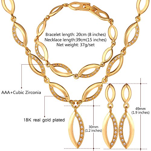 -. Title : U7 Jewelry Cubic Zirconia 18K Gold Plated Willow Leaf Chain Necklace Bracelet Earrings Set