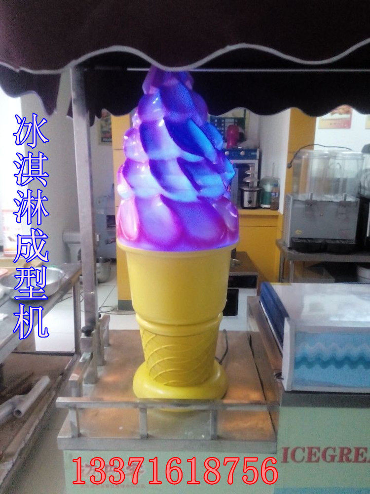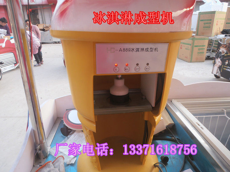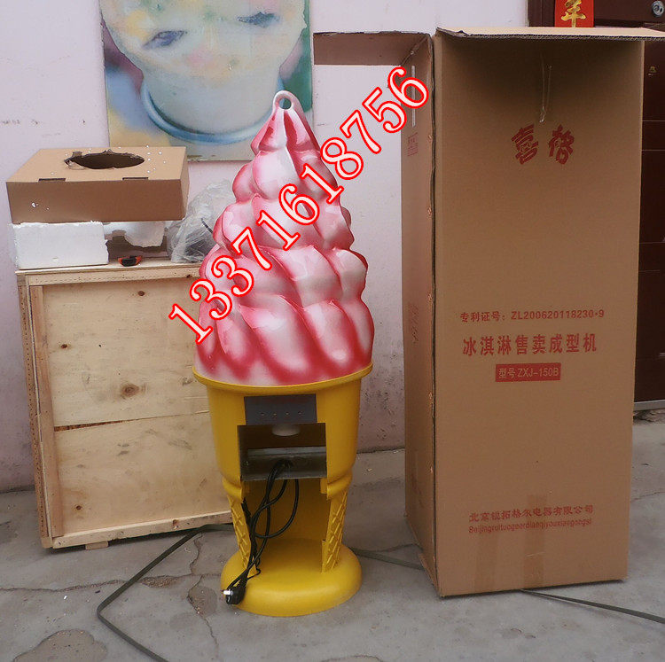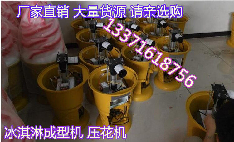 第三步:将装有冰淇淋的压花盒放入压花成型机中,通过压花成型机把冰淇淋从压花盒中挤压出来,同时配合冰淇淋蛋托,即可制作出硬质甜筒冰淇淋。(淋上果酱,颜色,口感更佳)