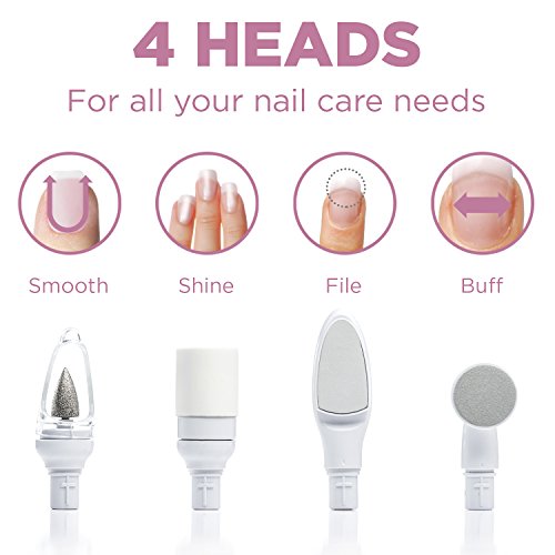 4 interchangeable head attachments: ? Grinding head: Remove dead skin along the cuticle of your nails ? Sandpaper filing head: Grind the nail surface and shape nails. ? Double-sided buffing head: Used to smooth out nail surface. The back of the buffing head is used to remove calluses. ? Polishing head: Used to create an immaculate shiny nail surface