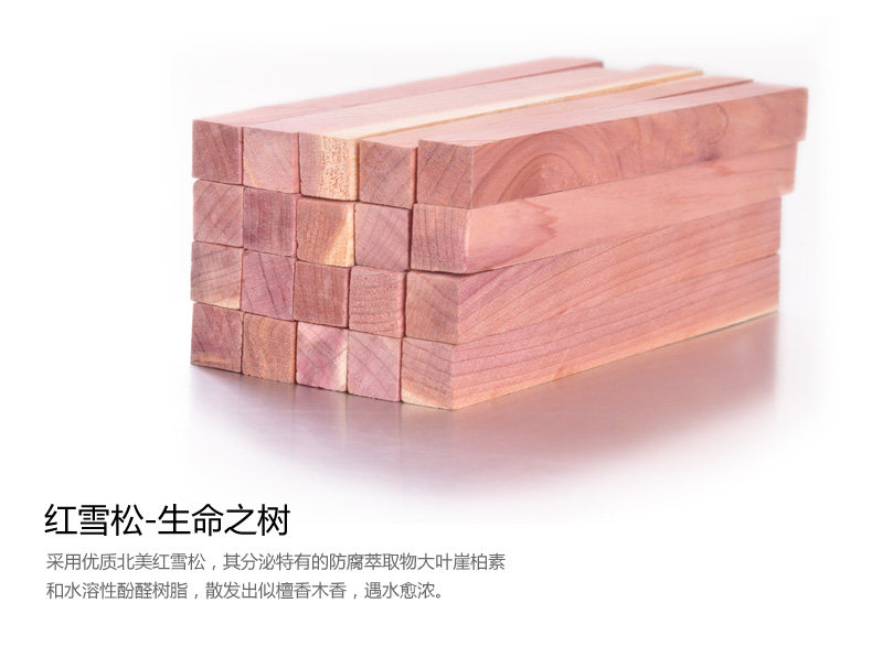 红雪松采用手工制造,没有任何油漆、涂料的覆盖,健康环保、安全无毒。表面会略有毛糙,纹理比较特殊是红白相间的,存在天然色差,亲不要介意哦!