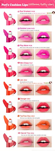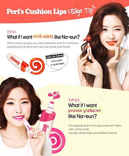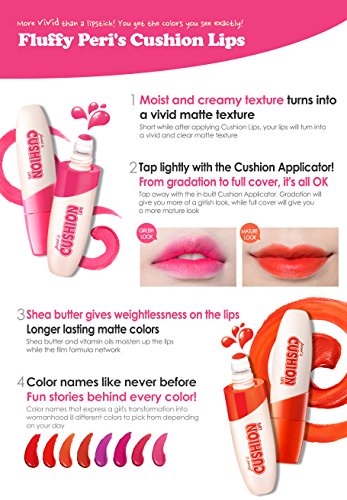 Peripera, Peri's Cushion Lips is a fun and colorful lip tint in the best shades. Easy to apply, the cushion-tip applicator glosses the lips quickly for full-coverage look. Add color and moisture to your lips with this creamy texture that leaves a fluffy matte finish. Create a cute lip gradation easily with its sponge tip applicator, or go for a bold and vivid full cover lip. Formulated with shea butter, vitamins, and natural oils create the perfect matte lip without having to worry about your lips drying out. Be risque and take on different looks with the various color options, go from a cute girly look, to a spicy dangerously bold lip look, or be neutral and soften things up with a perfected gradient lip.Feature
